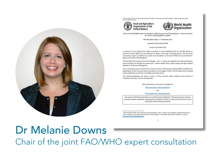 Chaired by Melanie Downs from the University of Nebraska-Lincoln and with Jason Tye-Din from Australia’s Walter and Eliza Hall Institute as rapporteur, the team reviewed the latest research on gluten exposure, food labelling, and detection methods. Their work involved modelling real-world eating habits and cross-contact risks to determine a safe reference dose for unintended gluten in food.